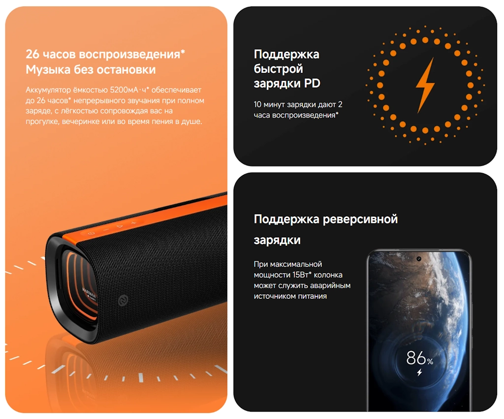 Аккумулятор ёмкостью 5200 мА·ч обеспечивает до 26 часов воспроизведения на одном заряде. Поддержка быстрой зарядки PD позволяет получить до 2 часов музыки всего за 10 минут зарядки, а функция реверсивной зарядки мощностью до 15 Вт превращает колонку в резервный источник питания для ваших устройств.