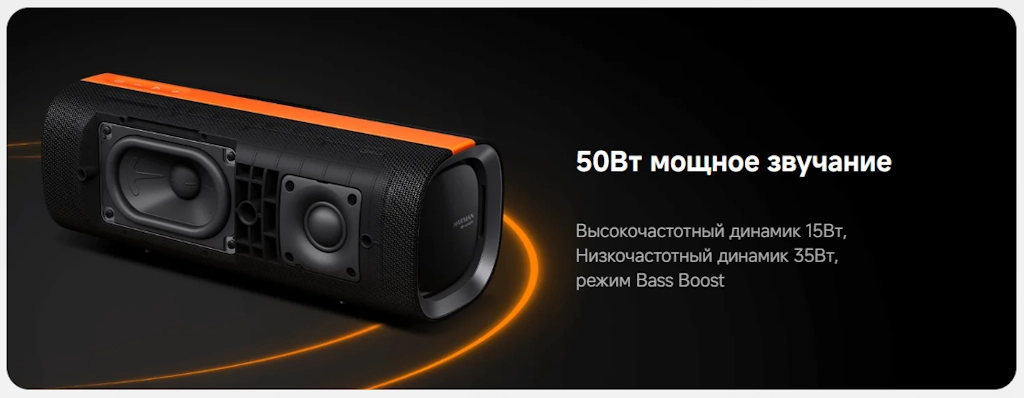 Система из высокочастотного динамика мощностью 15 Вт и низкочастотного динамика 35 Вт формирует широкую звуковую сцену с чистыми средними частотами, яркими верхами и глубоким басом. Режим Bass Boost усиливает низкие частоты, делая звук более объёмным и насыщенным.