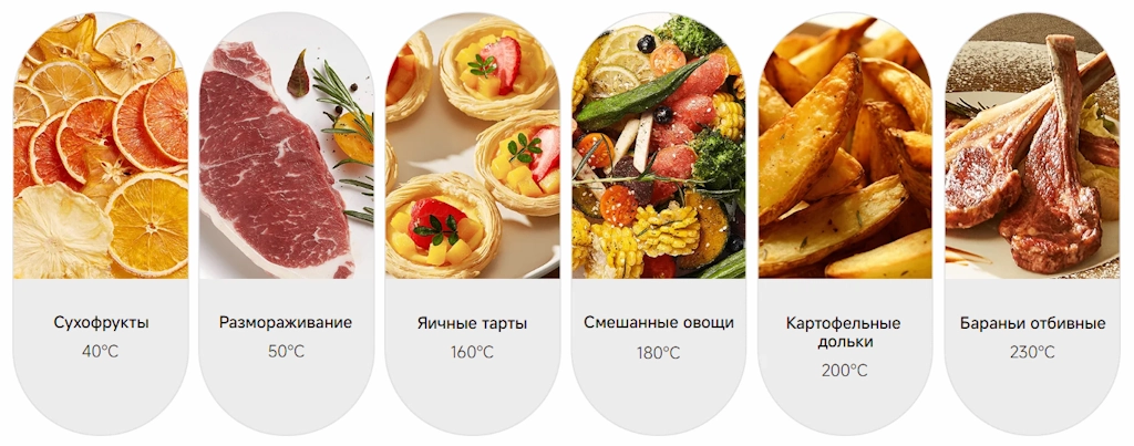 Выбирайте готовые режимы для картофеля фри, куриных ножек, стейка, рыбы, овощей, пиццы, тортов, сухофруктов или разогрева. Также доступен ручной режим для индивидуальных настроек.