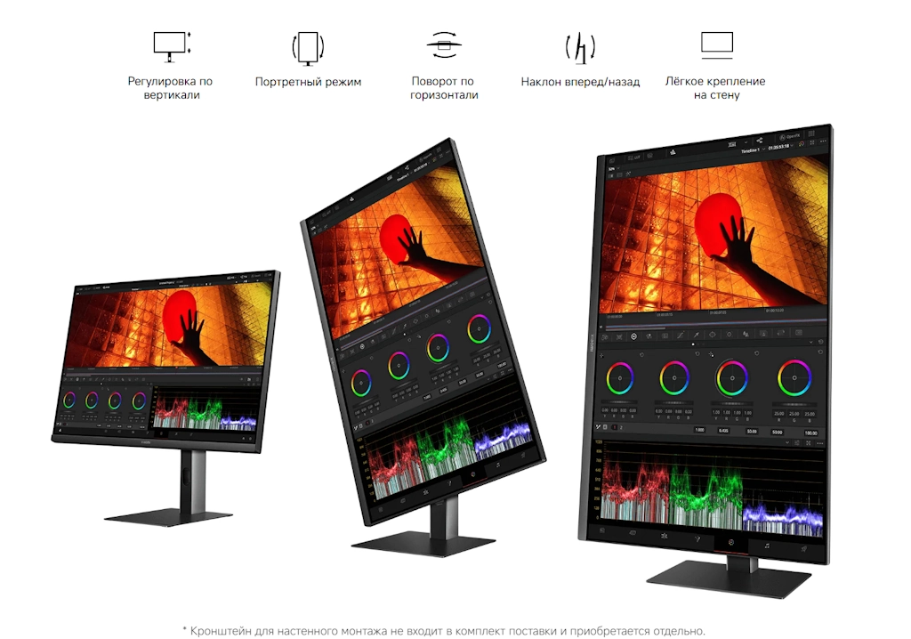 Подставка поддерживает регулировку высоты, угла наклона, поворот и портретный режим, а также совместима с настенным креплением.