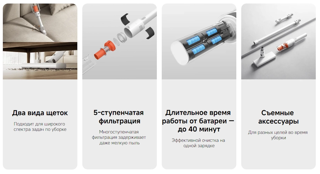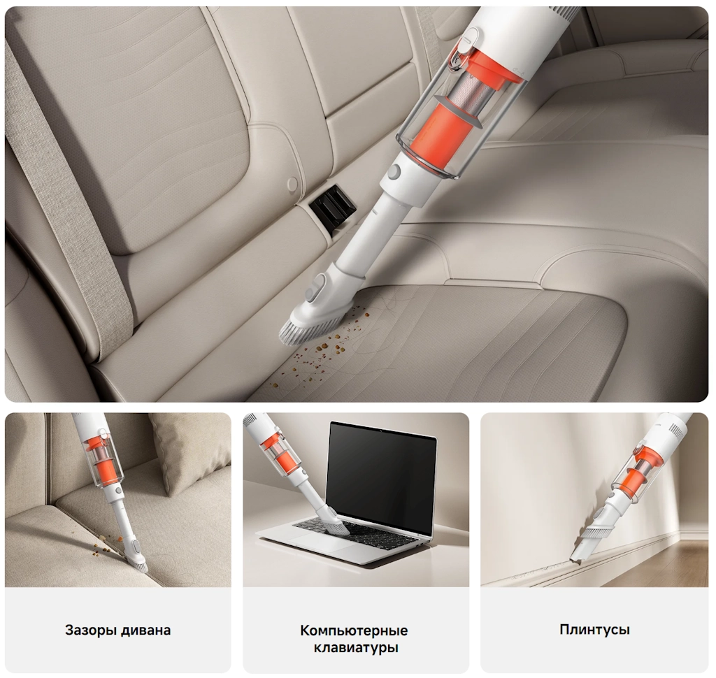 Все насадки легко снимаются и заменяются, позволяя адаптировать пылесос под разные сценарии уборки. Компактное хранение делает устройство удобным даже в небольших пространствах.