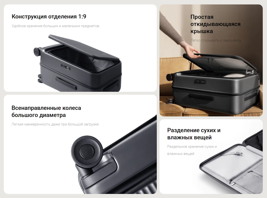 Инновационный дизайн с пропорцией 1:9 увеличивает вместимость чемодана и позволяет удобно хранить вещи любого размера. Глубокое внутреннее отделение идеально подходит для габаритных предметов, а откидывающаяся крышка обеспечивает быстрый доступ к содержимому одной рукой. При закрытии вещи остаются на месте, сохраняя порядок.