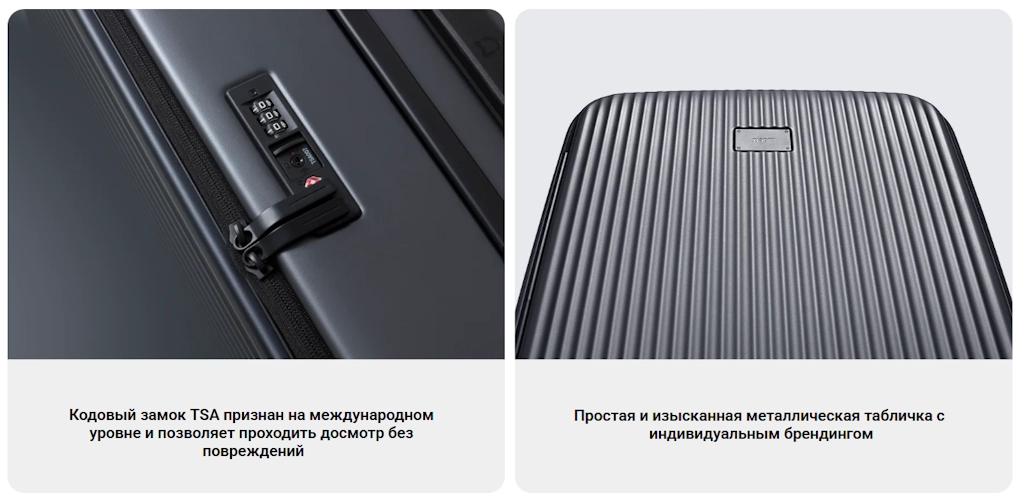 Чемодан оснащен встроенным кодовым замком TSA, который признан на международном уровне и позволяет проходить досмотр без повреждений. Дополняют дизайн металлическая табличка с брендингом, встроенная телескопическая ручка и анодированные выдвижные секции с 4 уровнями регулировки, обеспечивая долговечность и комфорт использования.
