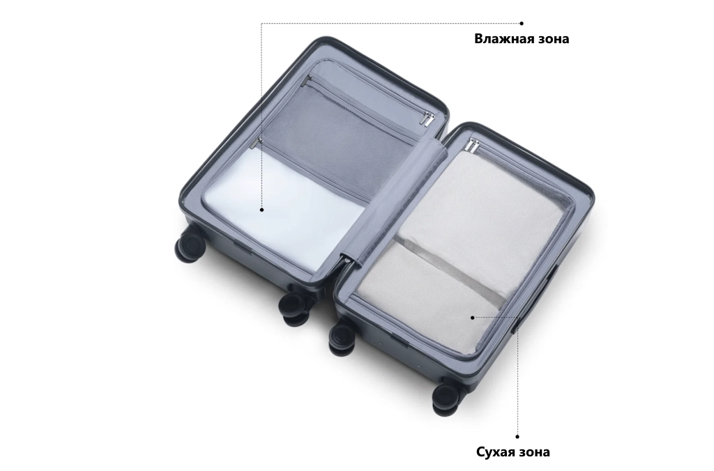 Внутренние U-образные молнии предотвращают выпадение вещей и обеспечивают быстрый доступ. Отдельное отделение для влажных вещей позволяет хранить их отдельно от сухих, сохраняя порядок и удобство упаковки.