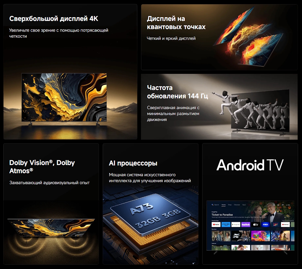 Передовая матрица с технологией квантовых точек передаёт более насыщенные и естественные цвета. Поддержка 1 миллиарда оттенков позволяет добиться по-настоящему кинематографического качества изображения прямо у вас дома.