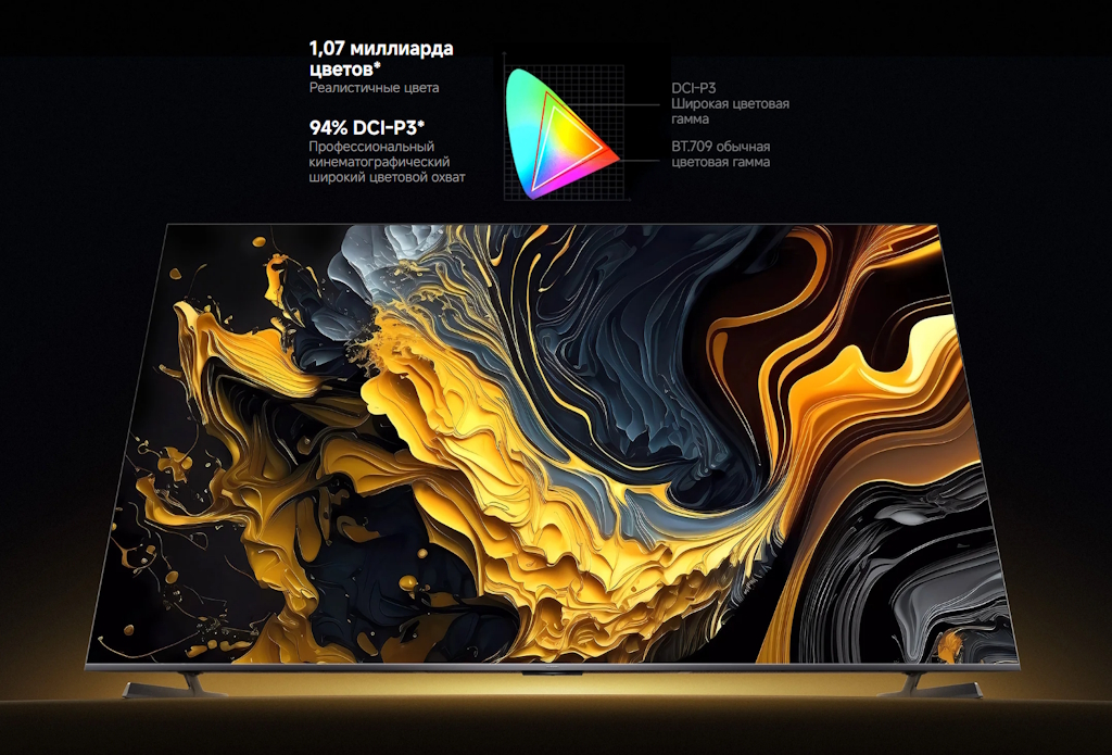 Телевизор точно отображает цвета при разных температурах, соответствуя стандарту DCI-P3. Это делает его подходящим не только для развлечений, но и для профессионального использования, где важна точная цветопередача.