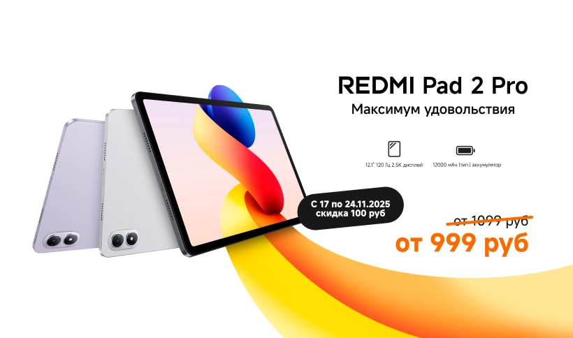 С 17 по 24 ноября только для первых покупателей планшет Xiaomi Redmi Pad 2 Pro со скидкой 100 рублей!